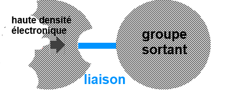 Un groupe partant nucléofuge est une partie de molécule qui a tendance à partir avec les deux électrons qui le relient au reste de la molécule et de compléter ainsi son octet. Un centre à haute densité électronique est une partie d'une molécule qui repousse le doublet électronique du groupe partant pour lui permettre d'emporter un doublet électronique. La qualité du groupe partant (importance du caractère nucléofuge) dépend de plusieurs facteurs: 1) La charge: Les groupes partants nucléofuges neutres partent plus facilement que les anions partants. En effet, en emportant un doublet, ces groupes laissent derrière eux souvent une charge positive et partent donc plus difficilement s'ils sont chargés négativement. Par ordre décroissant de qualité nucléofuge, on trouve par exemple: $H_2O$ l'eau $OH^-$ l'ion hydroxyde 2) La taille de l'atome par lequel le groupe partant est attaché. Les atomes qui sont plus gros permettent mieux les déplacements d'électrons dans leur nuage électronique (ils sont plus polarisables)! Par ordre décroissant de qualité nucléofuge, on trouve par exemple: $I^-$ l'ion iodure $Br^-$ l'ion bromure $Cl^-$ l'ion chlorure $F^-$ l'ion fluorure Nous voyons que la qualité nucléofuge décroît de haut en bas dans une famille du tableau périodique: $I\gt Br\gt Cl\gt F$ 3) Le solvant. Un solvant acide peut par exemple favoriser le départ de $OH$ en l'activant pour qu'il puisse partir sous forme de $H_2O$ neutre :
