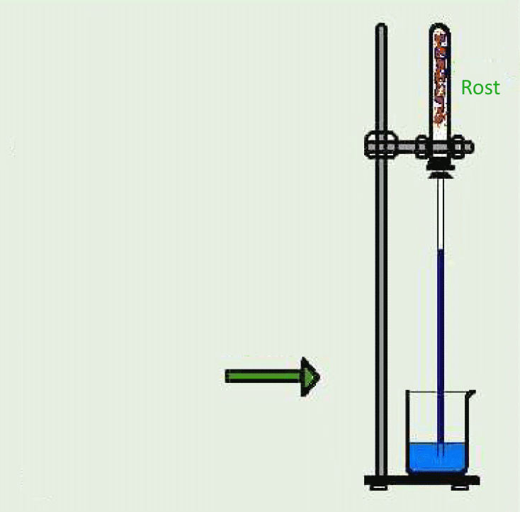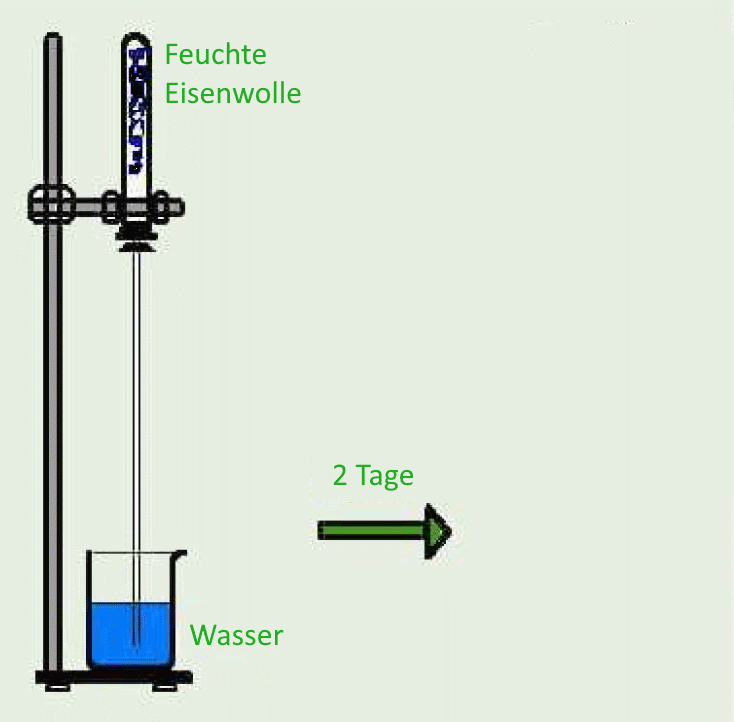 Die Röhre enthält feuchte Eisenwolle, im Becherglas ist Wasser.