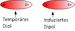 In allen Fällen ziehen die temporären und induzierten Teilladungen δ+ + und δ- sich gegenseitig an und dies führt zu einer Anziehungskraft zwischen den beiden Molekülen (Van-der-Waals- London-Dispersionskraft) )