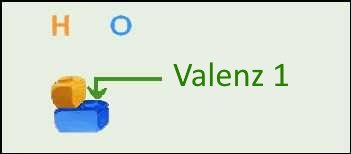Atom O bildet zwei Bindungen (es bindet an 2 "Stellen"): es hat Valenz 2. Ein H-Atom (z. B. das rechte) bildet eine Einfachbindung: Es hat Valenz 1.