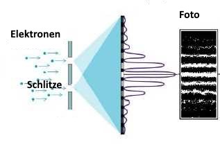 - Ein einzelnes Elektron, das auf eine Wand mit zwei Schlitzen projiziert wird, durchläuft beide Schlitze (wie eine Welle!)