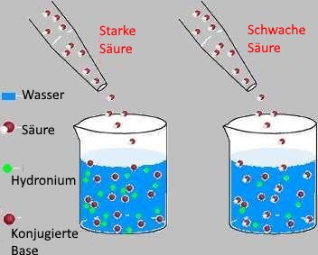 Die wässrige Lösung der starken Säure wird durch die entsprechenden Basen- und Hydroniumionen gebildet, während die schwache Säurelösung sowohl die Säure als auch die entsprechende Base und auch Hydroniumionen enthält.