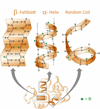 Die Sekundärstruktur wird als je nach lokaler Faltung als Peptidkettenhelix α bezeichnet. , oder β - Faltblatt oder ungeordnete "Random Coil"