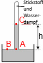 Der Wasserstand im Reagenzglas liegt $68\; mm$ über dem Tankniveau. Wissend, dass der Sättigungsdampfdruck von Wasser bei $ 20^o C $ 0,025 beträgt, wobei die Dichte des Wassers bei $ 20^o C $ 0,998 beträgt, ergibt sich die prozentuale Zusammensetzung von C, H , O und N.
