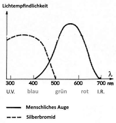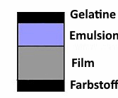 Der fotografische Film aus Plastik wird im Schutz des Lichts bedeckt - auf der Oberseite: 1) von einer Emulsion aus · Gelatine · Natriumbromid · Silbernitrat · Spuren von Schwefel · Spuren von Sensibilisatoren (Farbstoffe ähnlich Karottenfarbstoff) 2) eine Schutzschicht aus reiner Gelatine - auf der Unterseite: ein Farbstoff, der die Reflexion von Licht verhindert