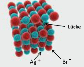 Die Ionen $ Ag^+ $ und $ Br^- $ ordnen sich in diesen Kristallen in Form von kubisch flächenzentrierten Gittern mit unregelmäßigen Lücken an: