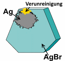 Die wenigen gebildeten Silberatome, die im Kristall zirkulieren, neigen dazu, auf der Oberfläche durch Gewinnung von Gitterenenergie (Energie aus der Bildung der Metallbindung) zu agglomerieren. Es wurde gefunden, dass diese Keime bevorzugt an Stellen gebildet werden, an denen Verunreinigungen wie Schwefel Kondensationskeime darstellen. Die Keime sind extrem klein. Wir können sie nicht mit bloßem Auge sehen. Sie sagen, dass sie das latente Bild bilden.