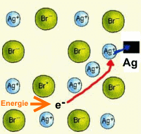 Die Sensibilisatoren absorbieren auch Licht und können diesen Energiegewinn auf das angeregte Elektron übertragen, um es in ein Quantenniveau ("Leitungsband") zu transportieren, wo es frei im Kristall fließen und die Silberionen erreichen kann, um sie zu reduzieren