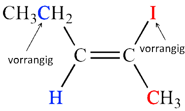 Ein Substituent hat Vorrang vor einem anderen, wenn das Atom, an das er gebunden ist, eine größere Atom(Protonen)zahl hat.