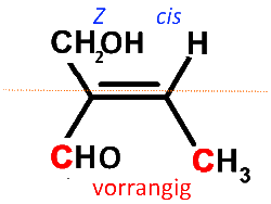Zwei Isomere Z oder E erscheinen, wenn jedes C-tragende Atom, das eine Doppelbindung trägt, zwei verschiedene Substituenten hat. Das Isomer Z oder cis hat die prioritären Substituenten auf der gleichen Seite der Achse, die aus der Doppelbindung besteht. Das Isomer E oder trans hat die prioritären Substituenten auf verschiedenen Seiten der Achse, die aus der Doppelbindung besteht.