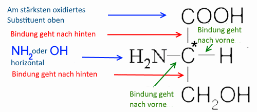 Abhängig von der Position der Amino- oder Alkoholgruppe links oder rechts auf der horizontalen Linie hat man 2 Enantiomere L oder D. Beispiel: