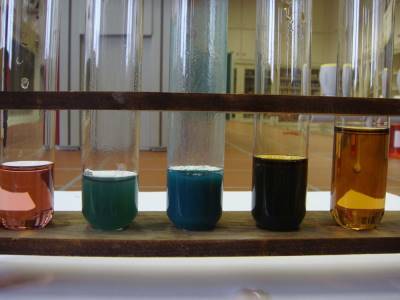Concentrated chlorhydric acid is added gradually (from left to right) to a copper(II) sulfate solution: