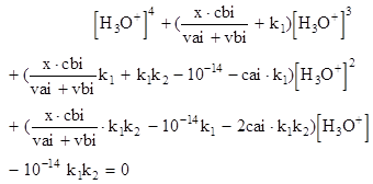 Titrated are $vai\; mL$ of a diacid with formal molar concentration $cai$ and succesives acidity constants $k1$ and $k2$ by $cbi\; M$ $NaOH$. a) Establish as a function of $x$ (= volume in $mL$ of base already added) 6 equations between molarities at equilibrium: $[H_2B]$, $[H_3O^+]$, $[HB^-]$, $[Na^+]$, $[B_2^-]$ and $[OH^-]$ (the electroneutrality condition, two conditions of conservation of matter, two equilibrium conditions and the ionic product of water) Find the equation that the system leads to.