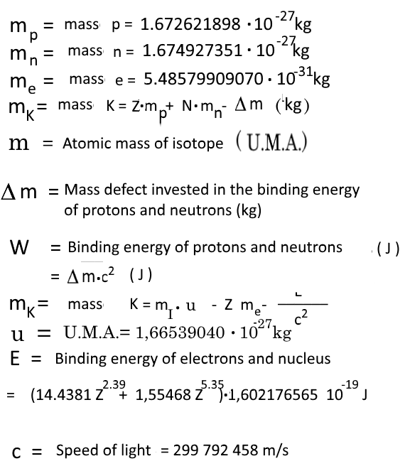 - $$\color{blue}{\rightarrow}\color{black}\;m_K \;= \;Z\cdot m_p+N\cdot m_n-\frac{W}{c^2} $$