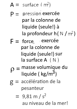 Pression hydrostatique: colonne liquide, hauteur, masse volumique, section, pression, force