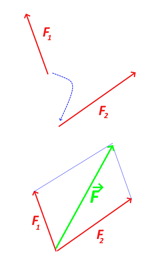 $\vec F$ hat dieselbe Wirkung wie $\vec F_1$ und $\vec F_2 $ Das ist ihre Resultante! Wir schreiben: $\vec F$ = $\vec F_1\ +\ \vec F_2 $